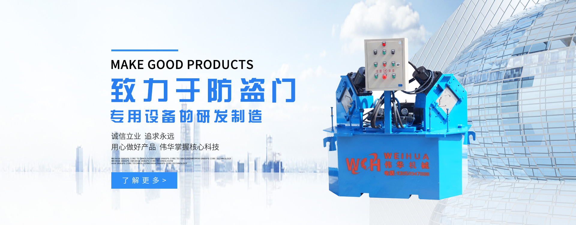 溫州偉華機(jī)械制造有限公司地處浙江溫州瑞安市塘下工業(yè)區(qū),創(chuàng)建于2009年,數(shù)年來(lái)全心致力于防盜門(mén)專(zhuān)用設(shè)備的研發(fā)制造,主營(yíng)產(chǎn)品有:門(mén)面成型機(jī)、門(mén)框成型機(jī)、熱壓膠合機(jī)、組合沖床、液壓折邊機(jī)、雙頭沖床、門(mén)面開(kāi)平機(jī)。現(xiàn)已具備獨(dú)特的管理模式和產(chǎn)品開(kāi)發(fā)能力,歷經(jīng)多年的努力,現(xiàn)已發(fā)展成為國(guó)內(nèi)最具影響力的機(jī)械設(shè)備企業(yè)之一。
